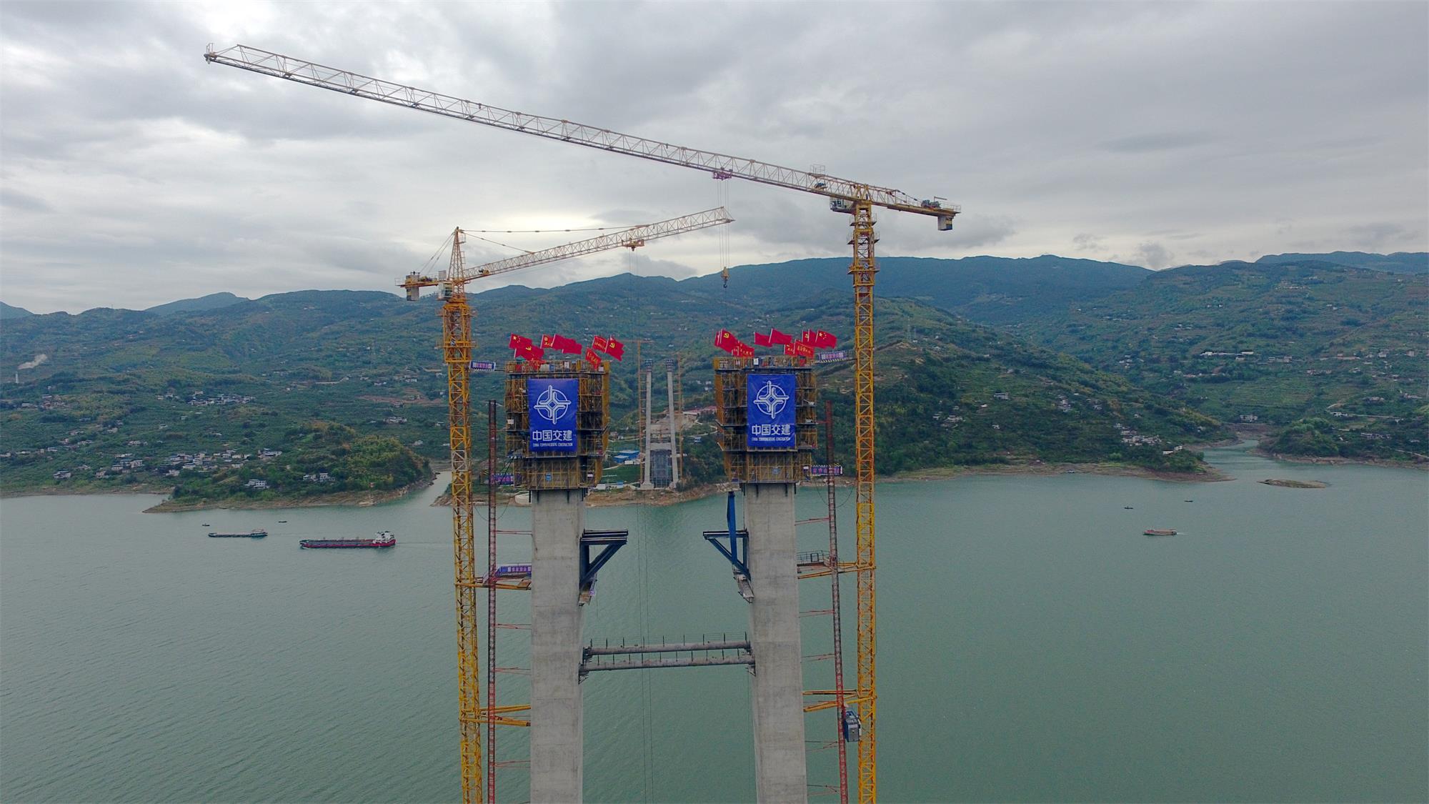 重慶萬州新田長江大橋是萬州環(huán)線高速公路的控制性工程,主跨長達1020米,是三峽庫區(qū)在建跨徑最大的橋梁。大橋主塔采用門式框架結(jié)構(gòu),結(jié)合既有山勢地形條件,采取不等高式高低塔,主塔左幅索塔高177.5米,右幅索塔高161.5米。施工組織充分考慮長江經(jīng)濟帶環(huán)保要求高、臨江陡崖地帶地形條件復(fù)雜、特種設(shè)備高空作業(yè)安全風險大等特點,通過BIM+技術(shù)集成深度應(yīng)用,成功對大橋結(jié)構(gòu)線型和索塔樁基等進行優(yōu)化,開創(chuàng)性使用全封閉式智能液壓爬模和高空無落地式支架體系。通過脫模劑比對試驗和配合比優(yōu)化管理,實現(xiàn)主塔混凝土拆模后達到“鏡面”效果,為類似主塔施工提供可靠大數(shù)據(jù)和可借鑒的寶貴經(jīng)驗支持。